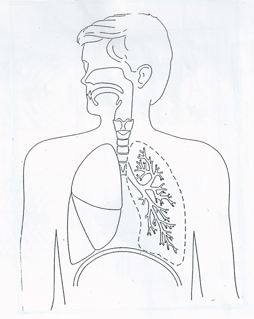 Max : « Pour la légende, il faut utiliser les mots ou expressions suivants : cavité buccale, cavité nasale, gorge, trachée, bronche, bronchiole, diaphragme, poumon. N’oubliez ni le titre ni l’échelle ! Pour vous aider sachez que la distance entre le nez et le diaphragme est d’environ 50 cm. »